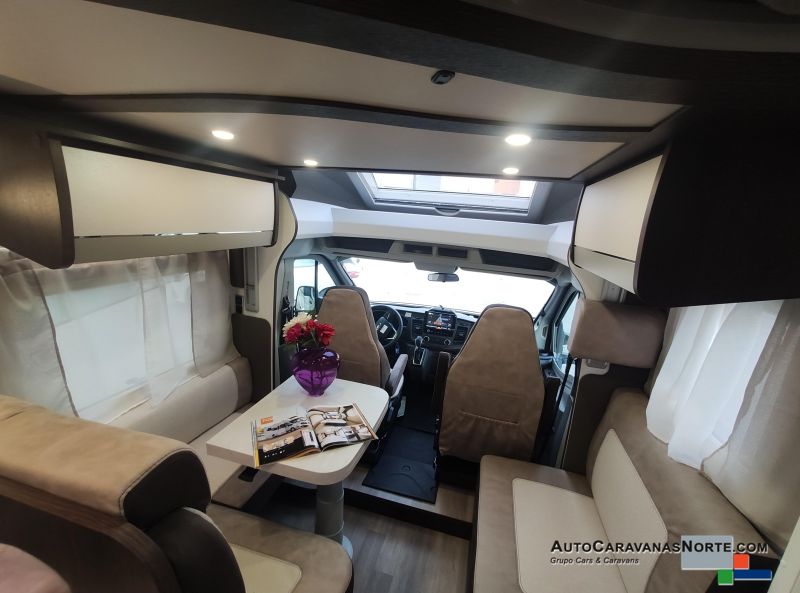 Benimar Tessoro 496 Northautokapp,con motor 170cv,cambio automático, eje trasero ensanchado, llantas de 16” con tornillo antirrobo, parachoques delantero pintado color cabina, luz de día, faros antiniebla delanteros + faros posición Led, faros halógenos con iluminación de ángulo fija, retrovisores eléctricos y calefactados, elevalunas eléctricos, cierre centralizado con mando a distancia, ABS+ESP, regulador de velocidad, aire acondicionado cabina manual, airbag conductor y pasajero, volante forrado en cuero y regulable en profundidad y altura, radio USB con bluetooth, mandos de radio en volante, asientos conductor y pasajero reclinables, giratorios y regulables en altura con 2 reposabrazos, fundas asientos cabina en ambiente célula, regulación lumbar.