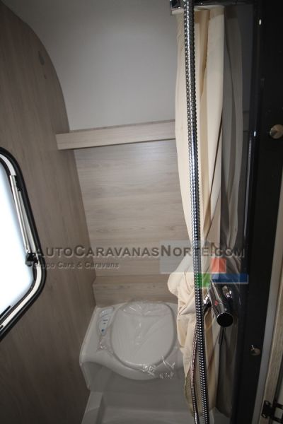 Caravana compacta de 7 plazas, con cama de matrimonio transversal, salón con mesa convertible en cama con claraboya, cocina de 3 fuegos con fregadera y frigorífico trivalente de 150 l. 3 literas longitudinales, la inferior abatible con ventanas. Baño con ducha.