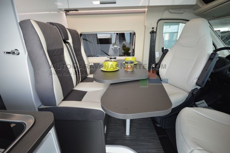 Aire acondicionado manual, airbags conductor y pasajero, control de crucero con limitador de velocidad, ESC especial para autocaravanas, volante y pomo en piel, salpicadero con acabado cromado, luces antiniebla, asientos giratorios con fundas, antena de radio DAB integrada. Somieres de láminas, oscurecedores de cabina plisado, Midi heki (claraboya 50*70), mesa plegable y extensible, escalón eléctrico, mosquitera puerta de entrada.