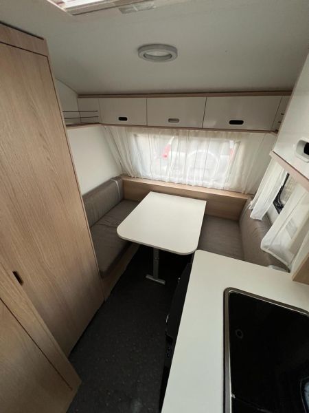 Caravana Adria Aviva 360 DK del año 2023, Caravana de 2 ambientes. Mide 5,53m con lanza y tiene un peso de 721kg. La disposición interior; comedor convertible en cama de matrimonio de 194 x 126 y dos literas de 194 x 64 y 184 x 64. Bloque cocina completo, tres fuegos y fregadero y frigorífico de 70L. Lavabo con WC químico completo. Equipada con estabilizador y Avance. 1 año de garantía. Caravana rutera.
