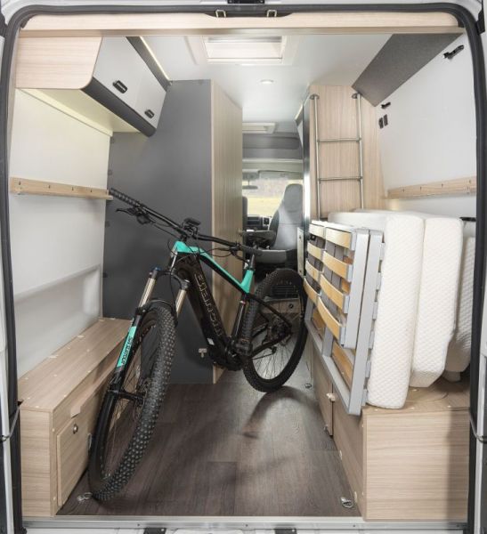 Autocaravana camper Sun Living V60 SP de la temporada 2021, con distribución de cama transversal, comedor, cocina y baño con ducha.