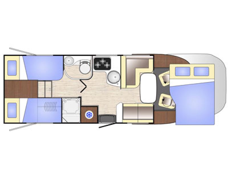 El Tessoro 463 perfilado 5 plazas es un modelo con habitación independiente con baño y 2 camas individuales que se puede convertir en una cama doble amplísima, también dispone de una cama doble basculante y un salón amplísimo y un garaje amplísimo con 2 portones exteriores.